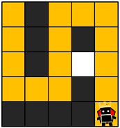 지금부터 당신은 한 팀의 팀원이 되어 게임을 진행하려고 합니다. 다음은 5 x 5 크기의 맵에, 당신의 캐릭터가 (행: 1, 열: 1) 위치에 있고, 상대 팀 진영은 (행: 5, 열: 5) 위치에 있는 경우의 예시입니다.