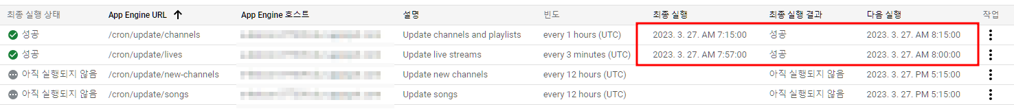/cron/update/lives 로 3분마다 GET요청을 보낼 것입니다. (이하 동일)